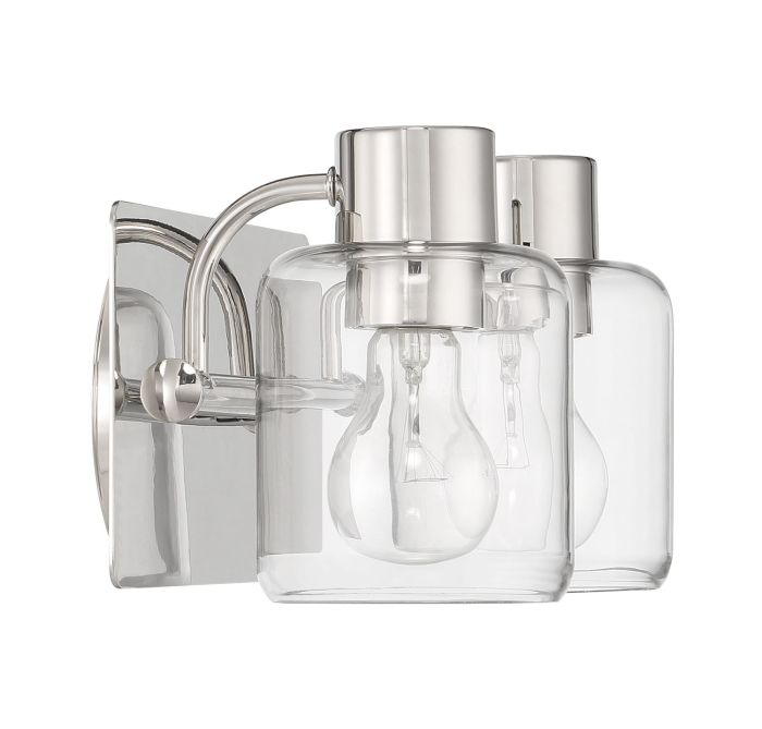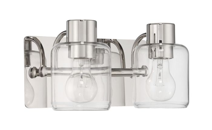 The Rori 2 Light Vanity in Polished Nickel combines transitional style with modern utility, making it ideal for a range of decors. This stunning vanity fixture features clear glass elegantly suspended from arched arms, supported by wide rectangular back plates. It requires two medium base bulbs, each with a maximum wattage of 60W (not included). With dimensions of 12.38 inches in width and 6.5 inches in height, and an extension of 6.75 inches, it is well-suited for damp locations due to its UL Damp Rating. This vanity fixture is perfect for enhancing your bathroom or powder room ambiance.