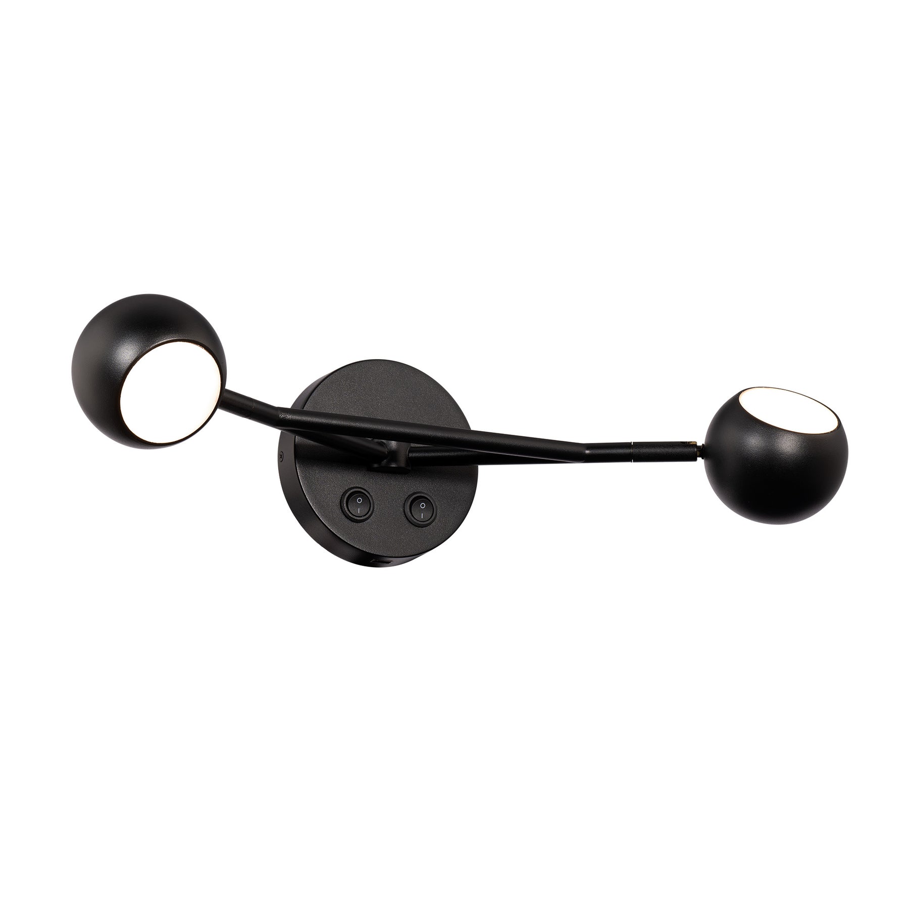 Duplex 20in 2-Light LED Reading Light 3000K in Black. The Duplex dome light. A rotatable neck accents a circular appeal for multidirectional illumination. Featuring aluminum construction, this updated retro-classic will appeal to many tastes. Two on/off toggle switch on the canopy to control each lamp individually and a USB port on the bottom of the canopy Hand adjustable, each light offers 330 degree horizontal rotation and a 90 degree vertical rotation Integral driver included in the backplate High Powered Replaceable LED Module CRI: 90, Rated Hours: 54,000, Color Temp: 3000K Standards: ETL & cETL UL 1598 listed for Damp Locations. CEC Title 24 Compliant.