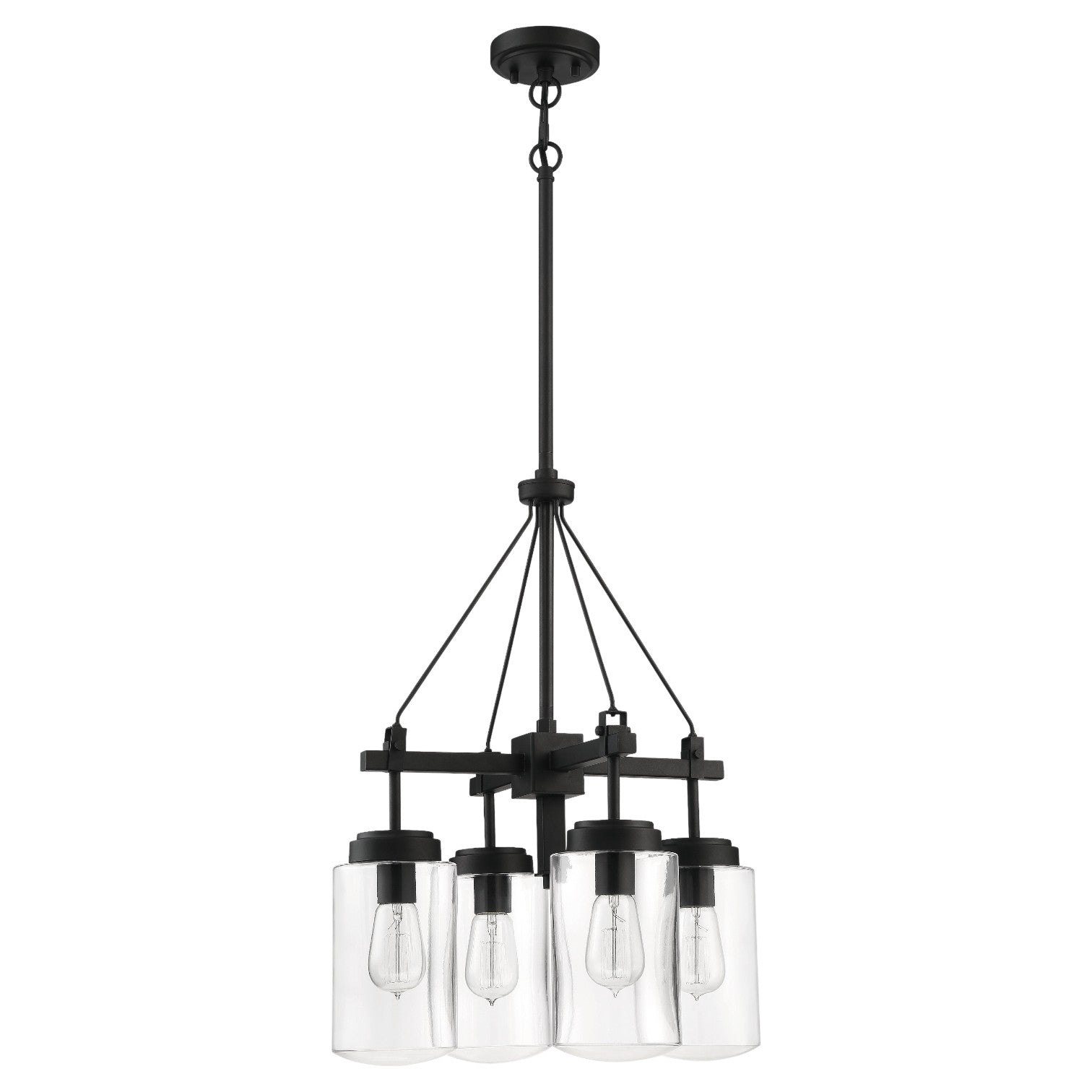 The Crosspoint - 52124-ESP Chandelier in Espresso is a striking combination of strength and elegance, perfect for both indoor and outdoor spaces. This wet-rated fixture features sturdy, angular frames with sealed clear glass canisters, ensuring durability and style. It requires four medium base A19 bulbs with a maximum wattage of 60W each (not included) and is designed with a downrod mounting method, suitable for wet locations. With dimensions of 24.88 inches in height, 18.25 inches in width, and 18.25 inches in depth, it also includes adjustable downrods of 3 x 12 inches and 1 x 6 inches for customizable hanging length. The chandelier comes with a one-year limited warranty, offering peace of mind with your purchase.