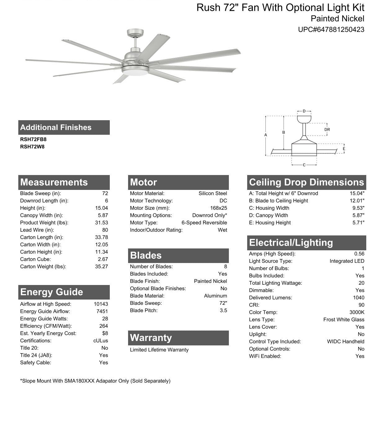 Designed to deliver maximum airflow, the wet-rated Craftmade Rush 72" ceiling fan with its eight custom aluminum blades features a quiet energy-saving 6-speed, reversible DC motor, integrated dimmable LED light with optional lens cover and is easily controlled with either the included remote control or the integrated Wi-Fi featuring breeze and timer functions compatible for use with most smart home devices, smart phones and systems with no additional hub needed.
