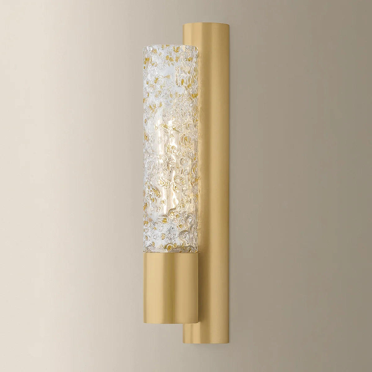 Ivalo is designed for everyday spaces where lighting needs to work hard without calling too much attention to itself. When illuminated, the speckled glass comes alive, creating a gentle shimmer that adds depth without glare. The tube form keeps the fixture visually slim, making it well suited for tighter layouts such as vanities, corridors, or bedside applications. The brass-finished hardware adds warmth and definition, helping the sconce read as finished and intentional. Used alone or in pairs, it integrates easily into layered lighting plans and complements both neutral and richly finished interiors.