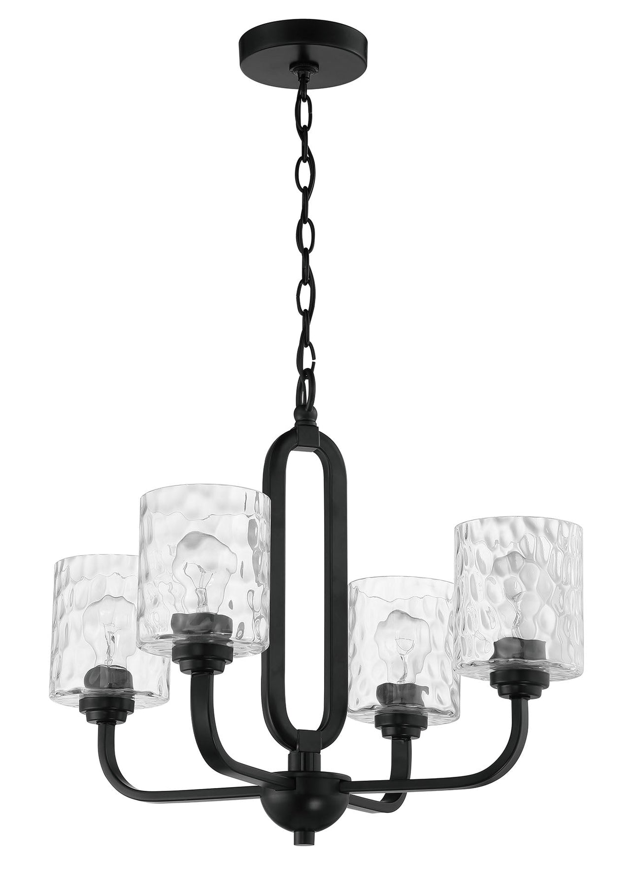 The Collins 4 Light Chandelier in Flat Black is a stylish addition to any indoor space, characterized by its elegant geometric design and clear hammered glass shades. This chandelier requires four medium base E26 bulbs with a maximum wattage of 60W each (not included). It features a 6FT chain for versatile hanging options and measures 23.75 inches in depth and width, and 18.75 inches in height, making it a perfect centerpiece. The product is indoor rated and comes with a 1-year limited warranty, ensuring both durability and satisfaction.