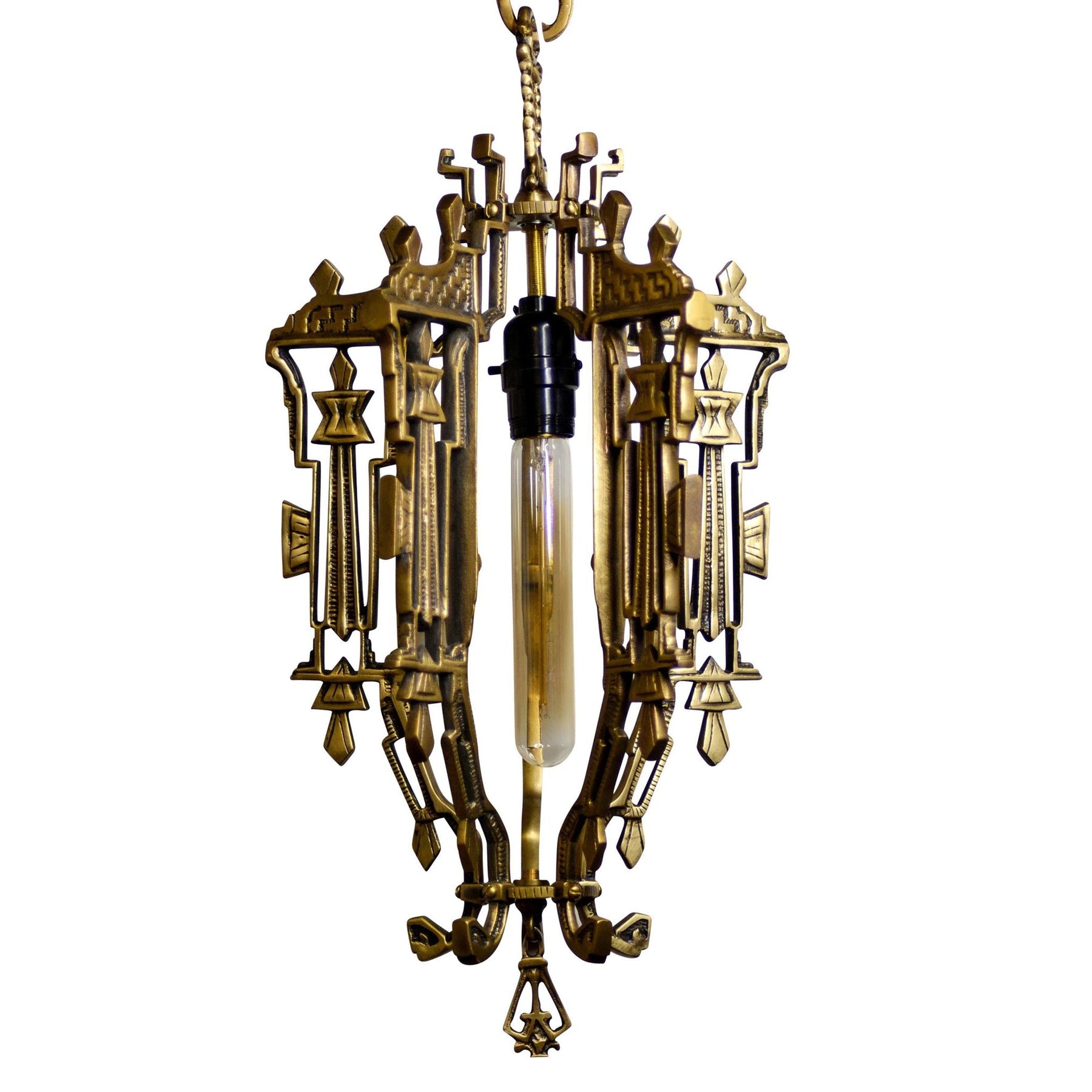 This Art Deco style lamp is solid brass. Each of the five panels art attached to the ornate discs on the top and bottom. This also comes with hand-made solid brass chain. This light works very well in Victorian, Art Deco and Rococo period styles.