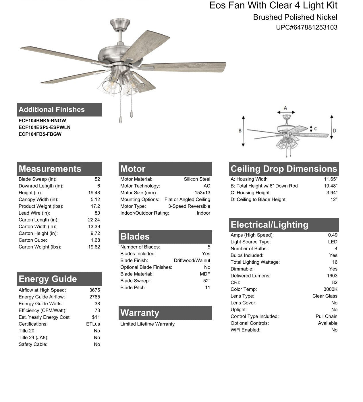 The Craftmade Eos 52" ceiling fan with clear glass four-light kit including dimmable LED bulbs features a smooth, 3-speed, reversible motor, updated blade arms, and reversible custom 52" blades. Optional remote controls are available (Sold Separately).