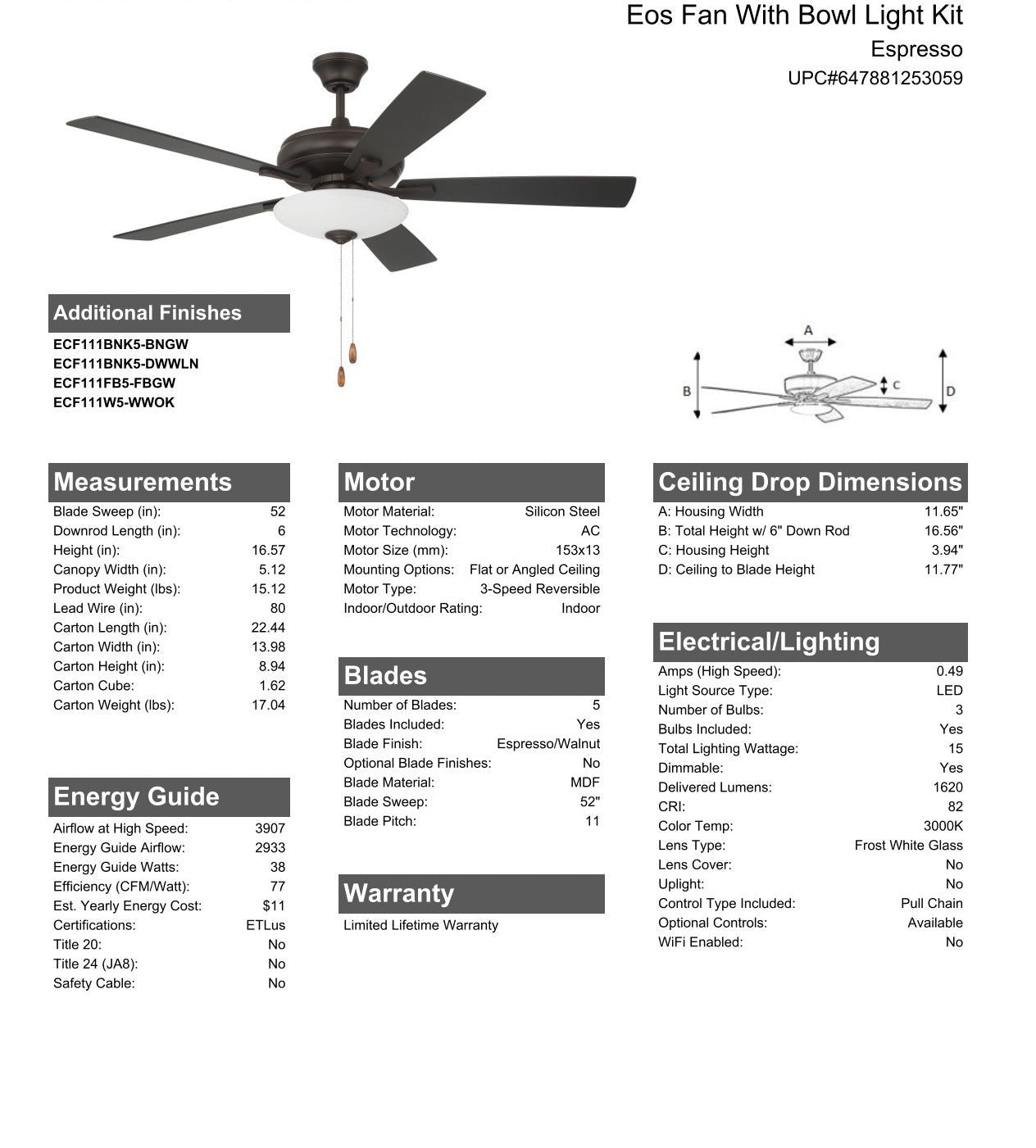The Craftmade Eos 52" ceiling fan with white frost glass low profile bowl three light kit including dimmable LED bulbs features a smooth, 3-speed, reversible motor, updated blade arms, and reversible custom 52" blades. Optional remote controls are available (Sold Separately).