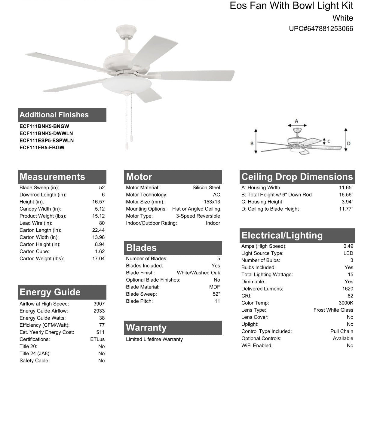 The Craftmade Eos 52" ceiling fan with white frost glass low profile bowl three light kit including dimmable LED bulbs features a smooth, 3-speed, reversible motor, updated blade arms, and reversible custom 52" blades. Optional remote controls are available (Sold Separately).