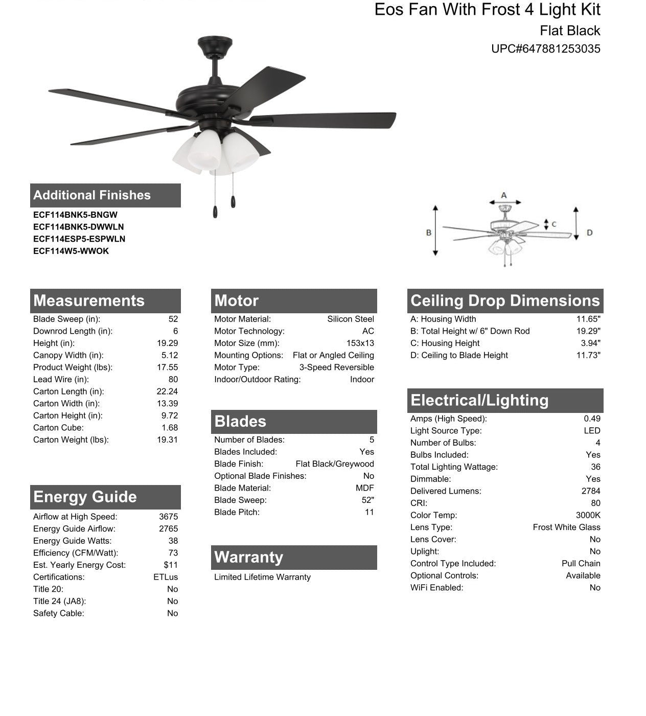 The Craftmade Eos 52" ceiling fan with white frost glass four-light kit including dimmable LED bulbs features a smooth, 3-speed, reversible motor, updated blade arms, and reversible custom 52" blades. Optional remote controls are available (Sold Separately).