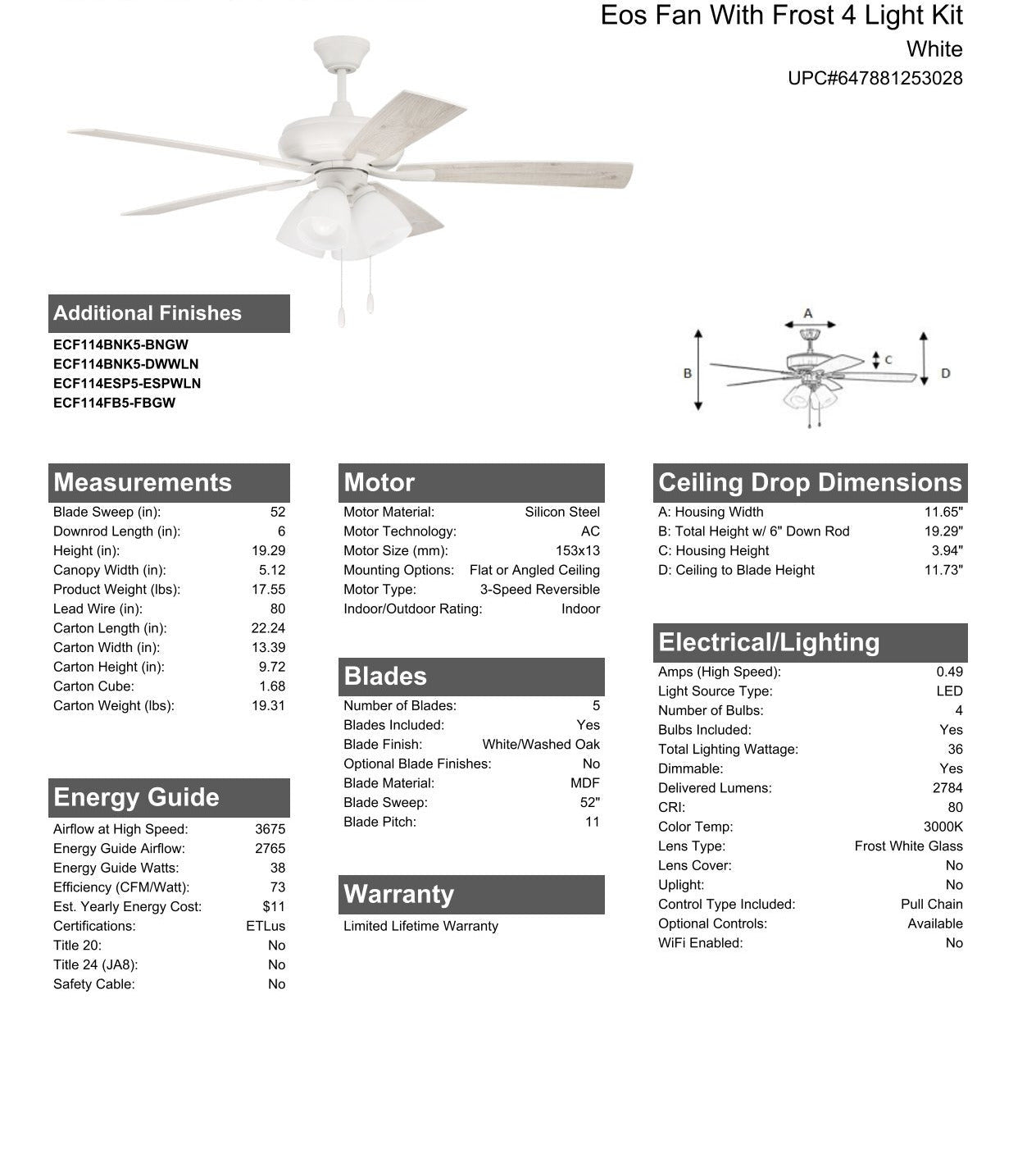 The Craftmade Eos 52" ceiling fan with white frost glass four-light kit including dimmable LED bulbs features a smooth, 3-speed, reversible motor, updated blade arms, and reversible custom 52" blades. Optional remote controls are available (Sold Separately).
