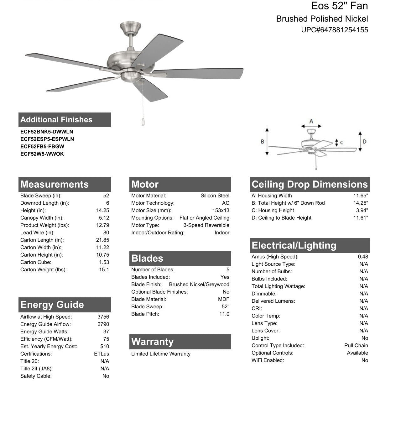 The Craftmade Eos 52" ceiling fan features a smooth, 3-speed, reversible motor, updated blade arms, and reversible custom 52" blades. Optional remote controls are available (Sold Separately).