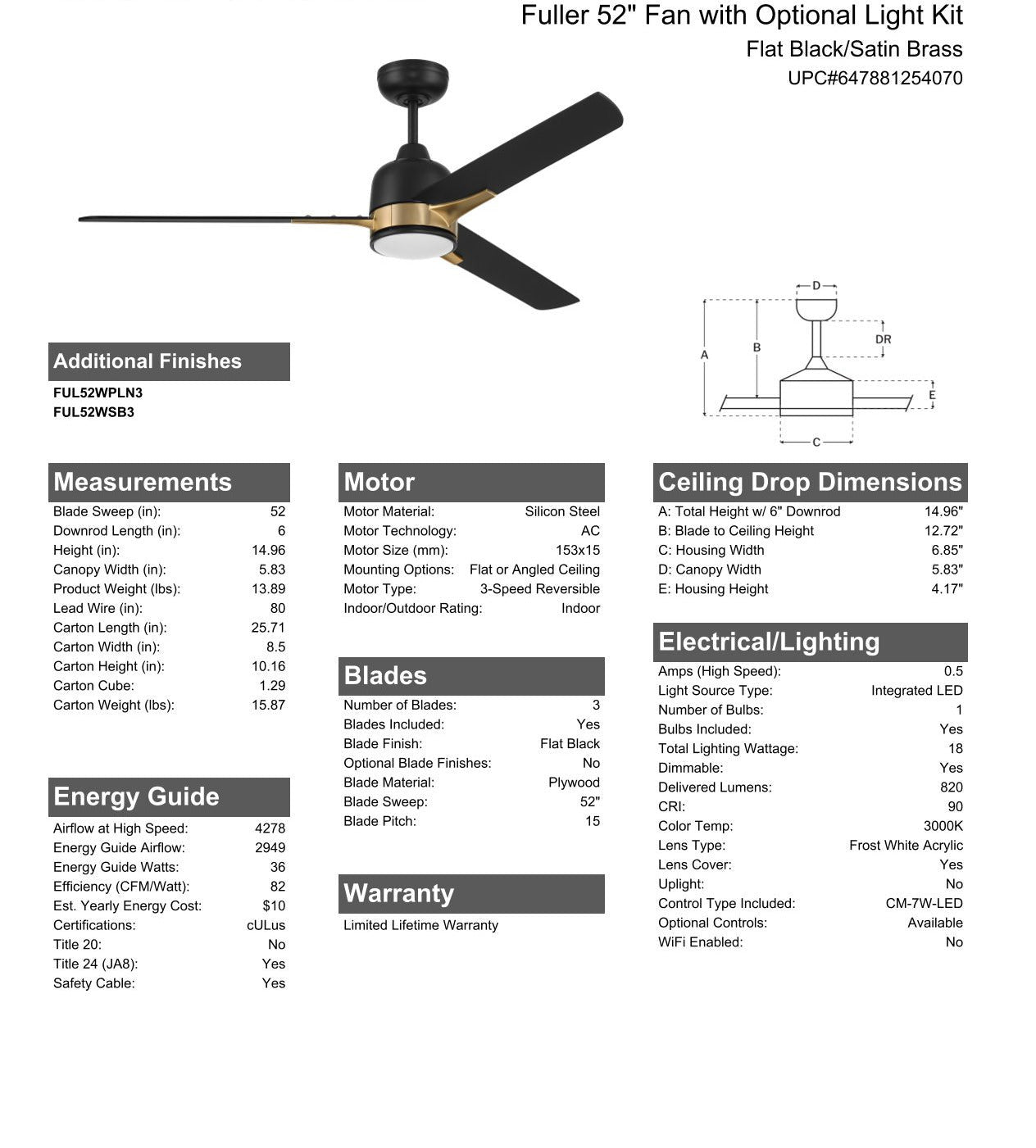 The Fuller 52" Ceiling Fan delivers minimalist style with maximum impact. A tremendous value, the Fuller 52" fan features an included (optional) 18 Watt dimmable LED light, sleek custom blades powered by a quiet, standard, 3-speed reversible motor, JA8/Title 24 compliance and a hard wired, 4-speed wall control perfect for use in single or multi residential applications.