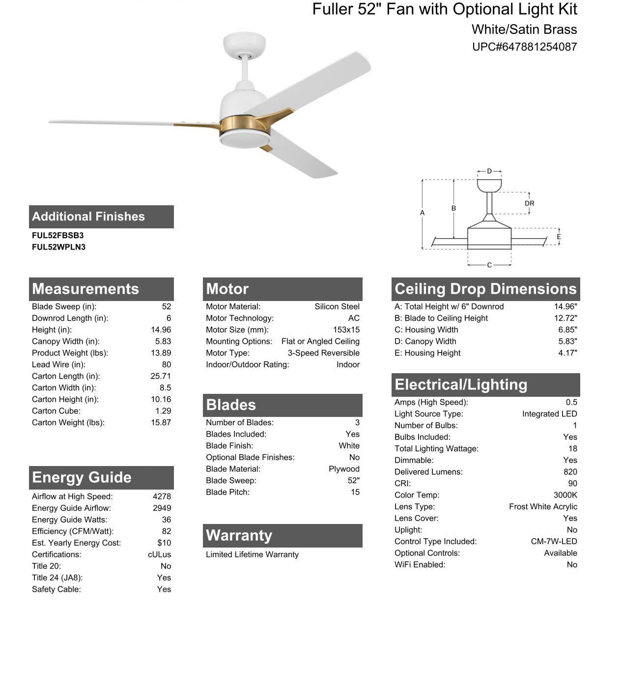 The Fuller 52" Ceiling Fan delivers minimalist style with maximum impact. A tremendous value, the Fuller 52" fan features an included (optional) 18 Watt dimmable LED light, sleek custom blades powered by a quiet, standard, 3-speed reversible motor, JA8/Title 24 compliance and a hard wired, 4-speed wall control perfect for use in single or multi residential applications.