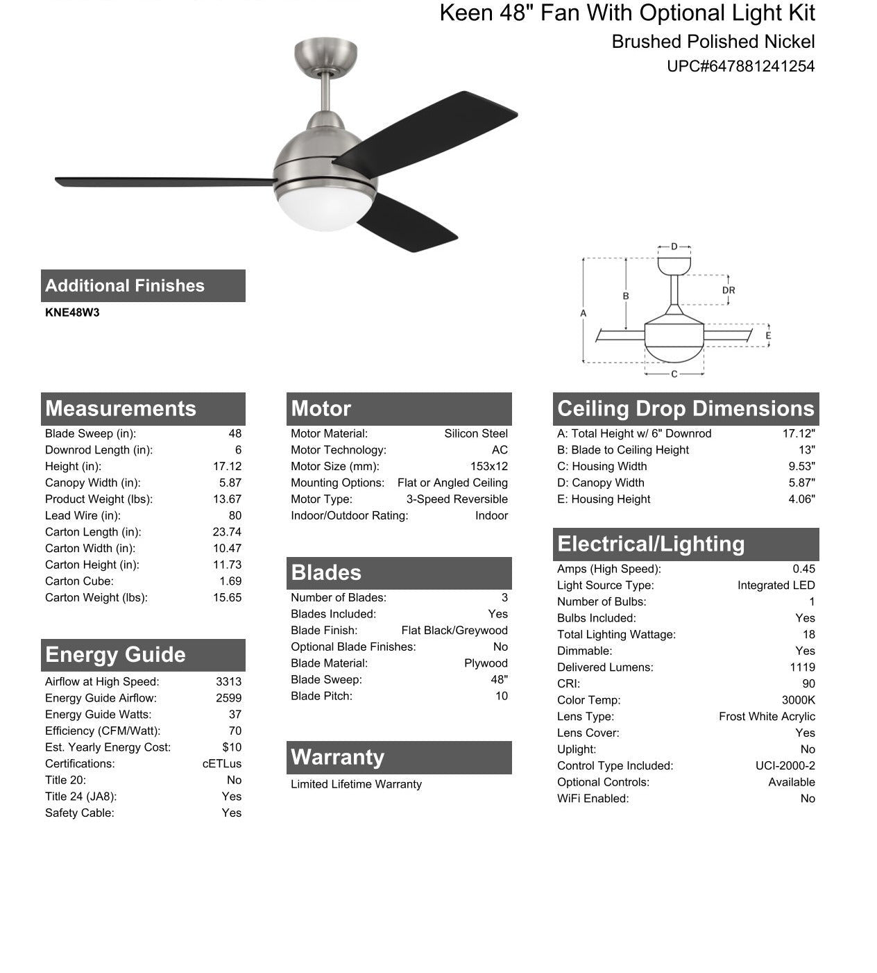 The simplistic silhouette, understated yet distinctive, and stylish good looks make the Keen 48" dual mount ceiling fan by Craftmade a smart choice. Offering a quiet standard, 3-speed reversible motor with custom reversible blades, seamlessly integrated white frost dimmable LED light kit with optional lens cover with remote and wall controls included, the Keen will provide years of performance and style.