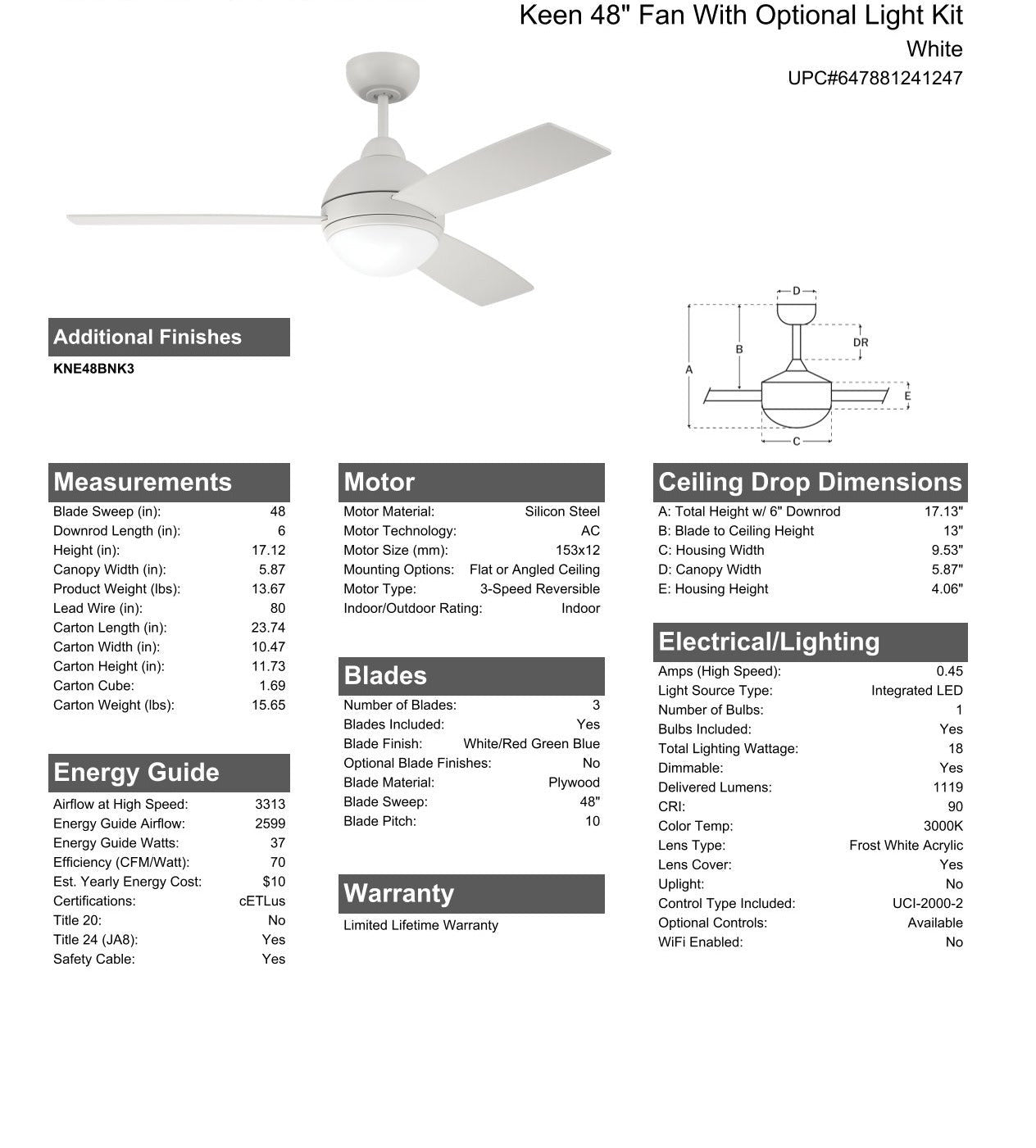 The simplistic silhouette, understated yet distinctive, and stylish good looks make the Keen 48" dual mount ceiling fan by Craftmade a smart choice. Offering a quiet standard, 3-speed reversible motor with custom reversible blades, seamlessly integrated white frost dimmable LED light kit with optional lens cover with remote and wall controls included, the Keen will provide years of performance and style.