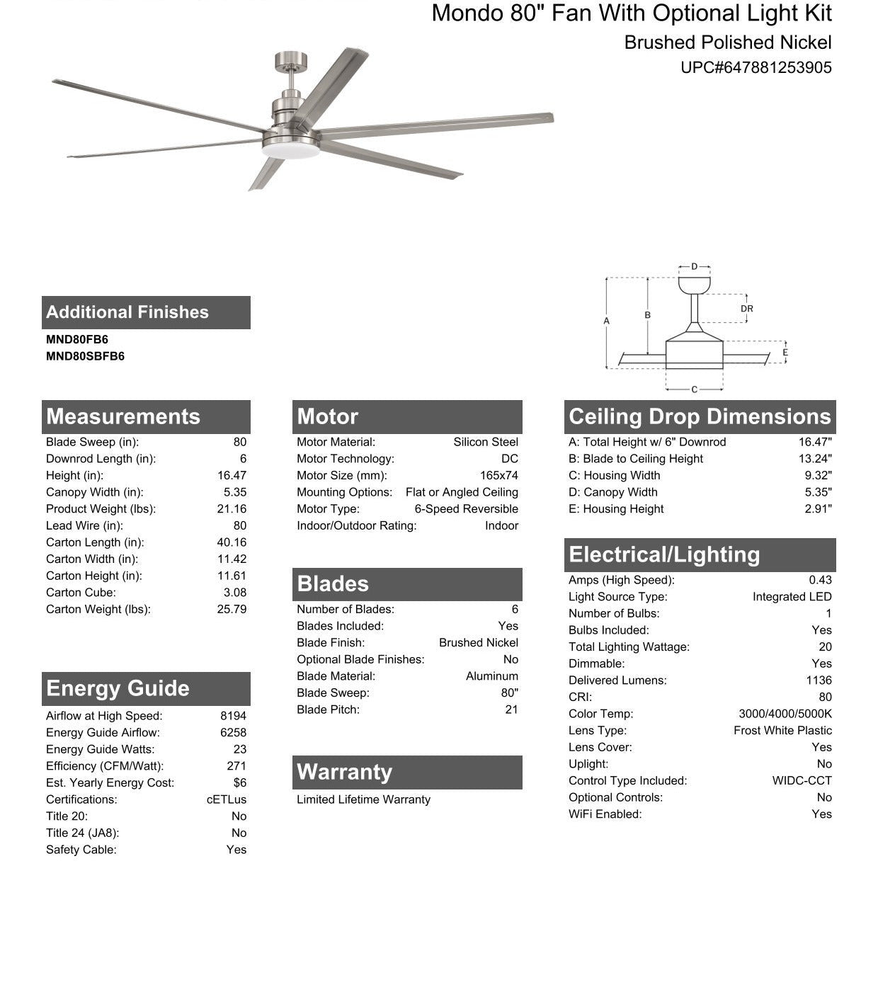 How do we make a best selling ceiling fan even better? We make it bigger, improve performance, and add a dimmable 3 CCT LED light kit. The Mondo 80" ceiling fan features an energy-saving, high-performance DC motor, set of six custom rolled aluminum blades, integrated 20W dimmable LED 3 CCT 3000-5000K light with optional lens cover and is easily controlled with either the included remote control or the integrated WIFI featuring breeze and timer functions compatible for use with most smart home devices, smart phones and systems.