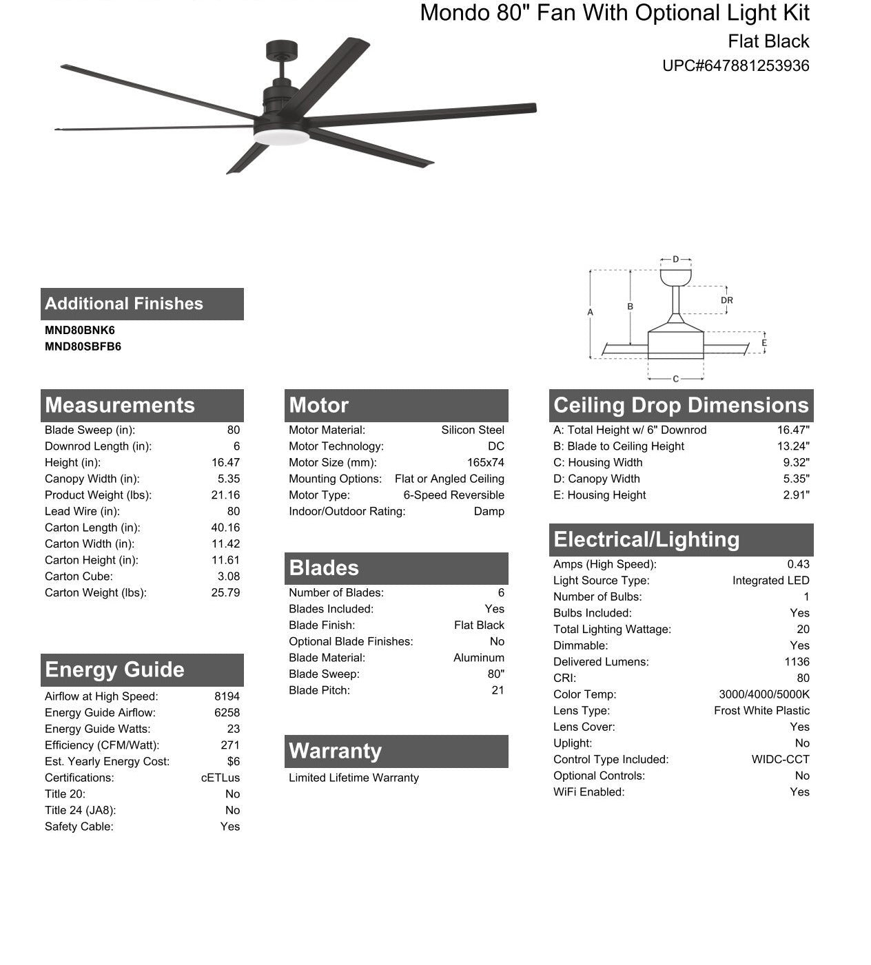How do we make a best selling ceiling fan even better? We make it bigger, improve performance, and add a dimmable 3 CCT LED light kit. The Mondo 80" ceiling fan features an energy-saving, high-performance DC motor, set of six custom rolled aluminum blades, integrated 20W dimmable LED 3 CCT 3000-5000K light with optional lens cover and is easily controlled with either the included remote control or the integrated WIFI featuring breeze and timer functions compatible for use with most smart home devices, smart phones and systems.