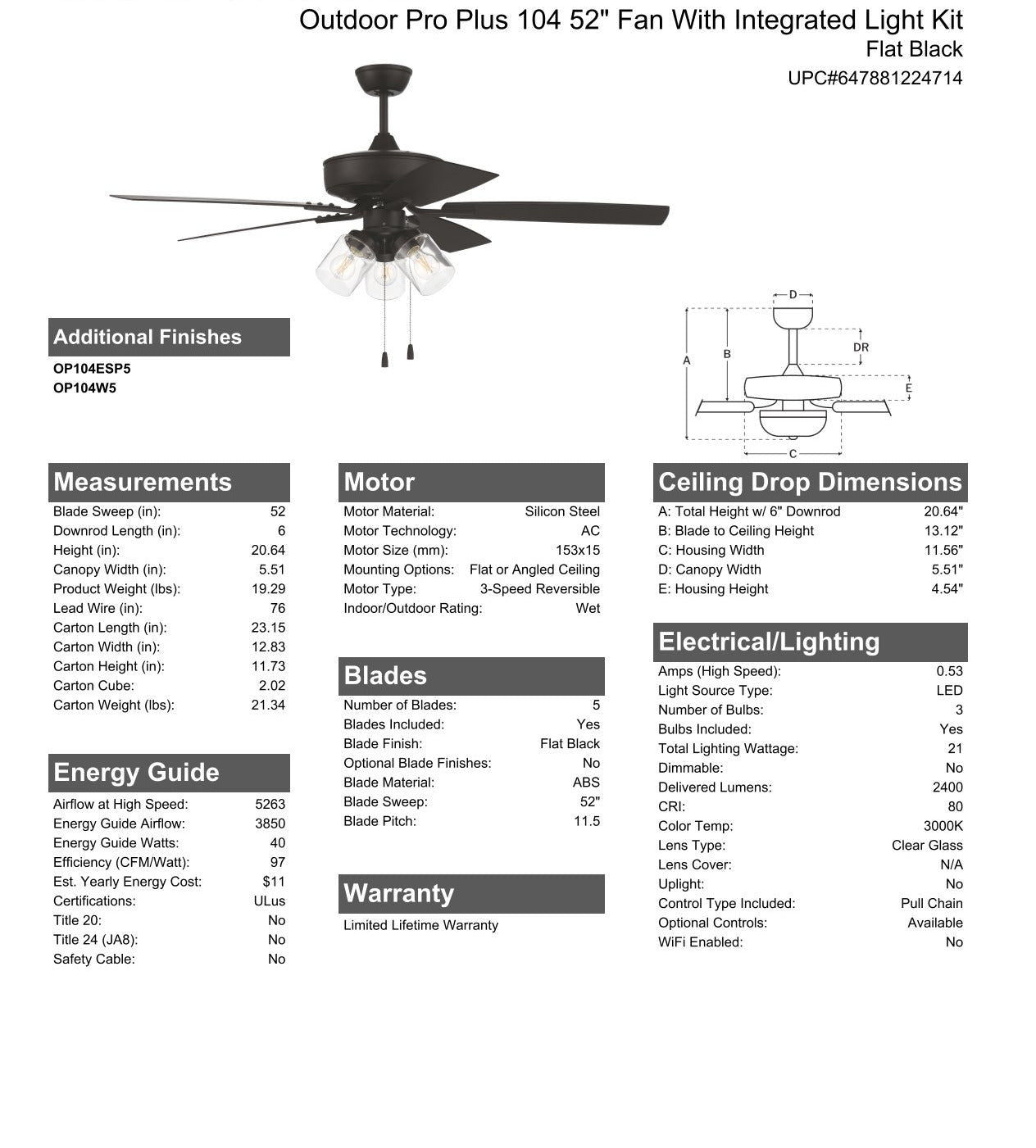 52" Outdoor Pro Plus 104 in Flat Black w/ Flat Black Blades
