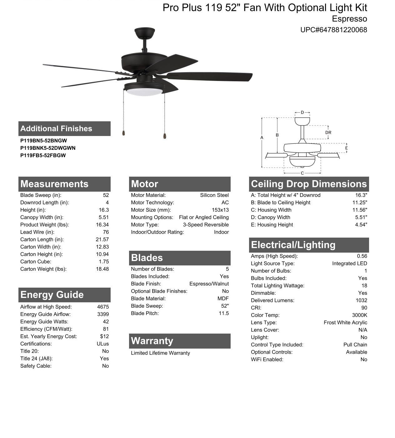 52" Pro Plus 119 in Espresso w/ Espresso/Walnut Blades