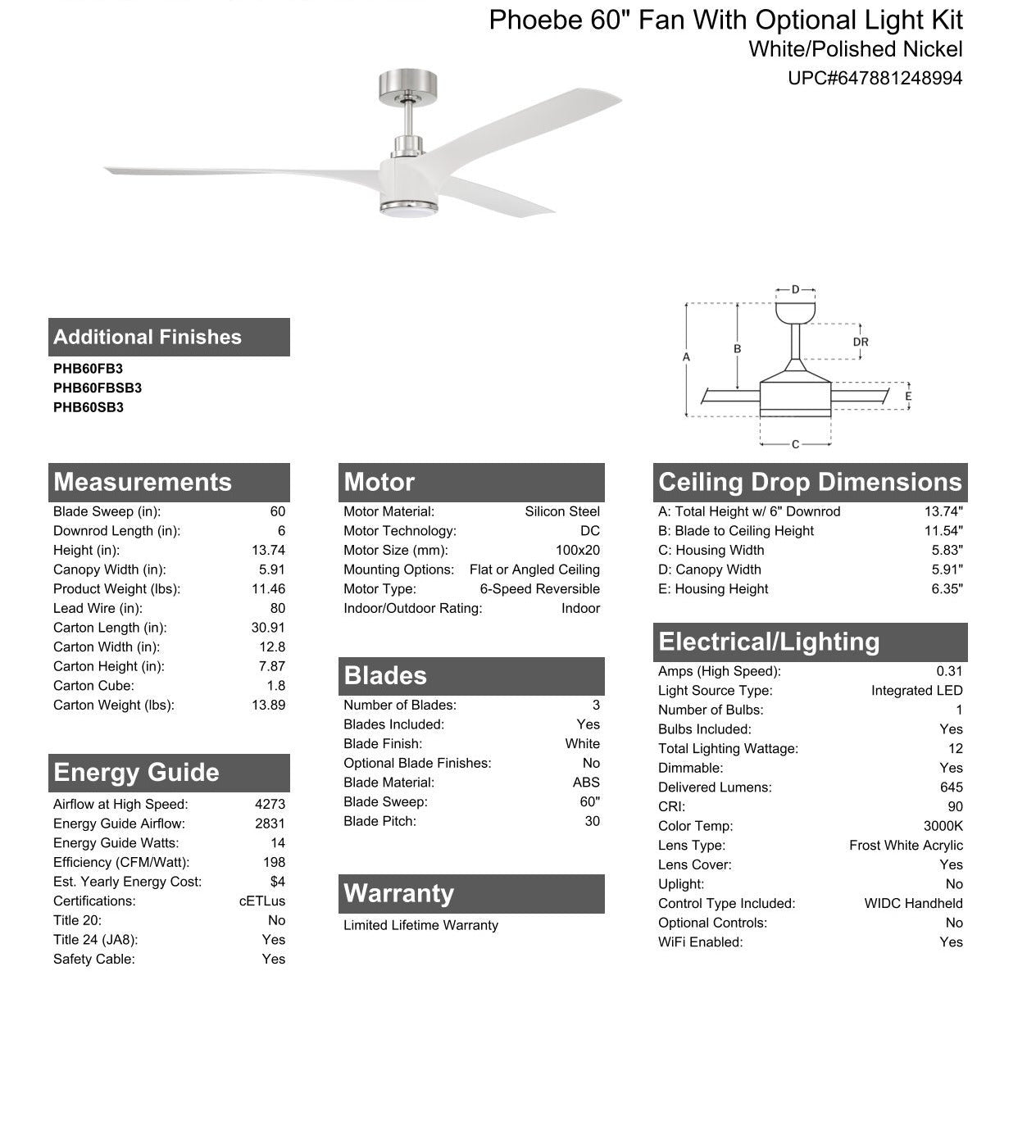 60" Phoebe in White/Polished Nickel w/ White Blades