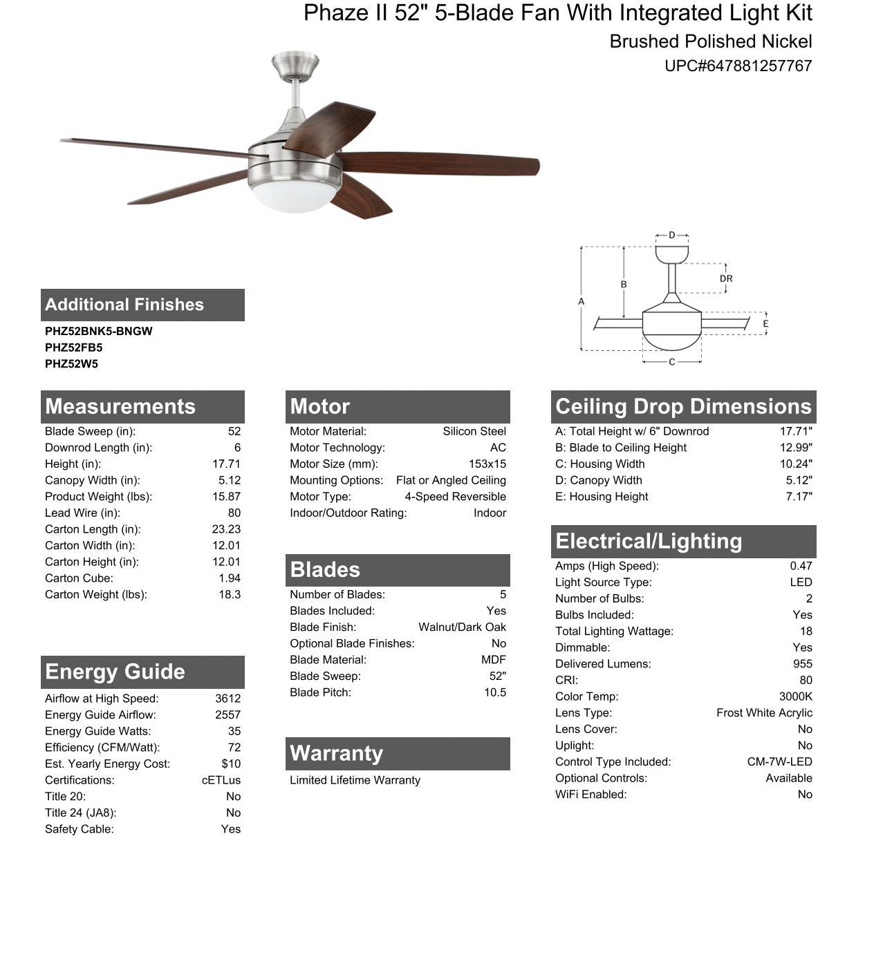 Ideal for single or multi-residential use, the modern and minimalist Phaze II 52" ceiling fan features a sleek integrated dimmable LED Light with 2 x 9W bulbs included, standard, 4-speed, reversible motor, reversible 5-blade design and included hard wired, 4-speed wall control.